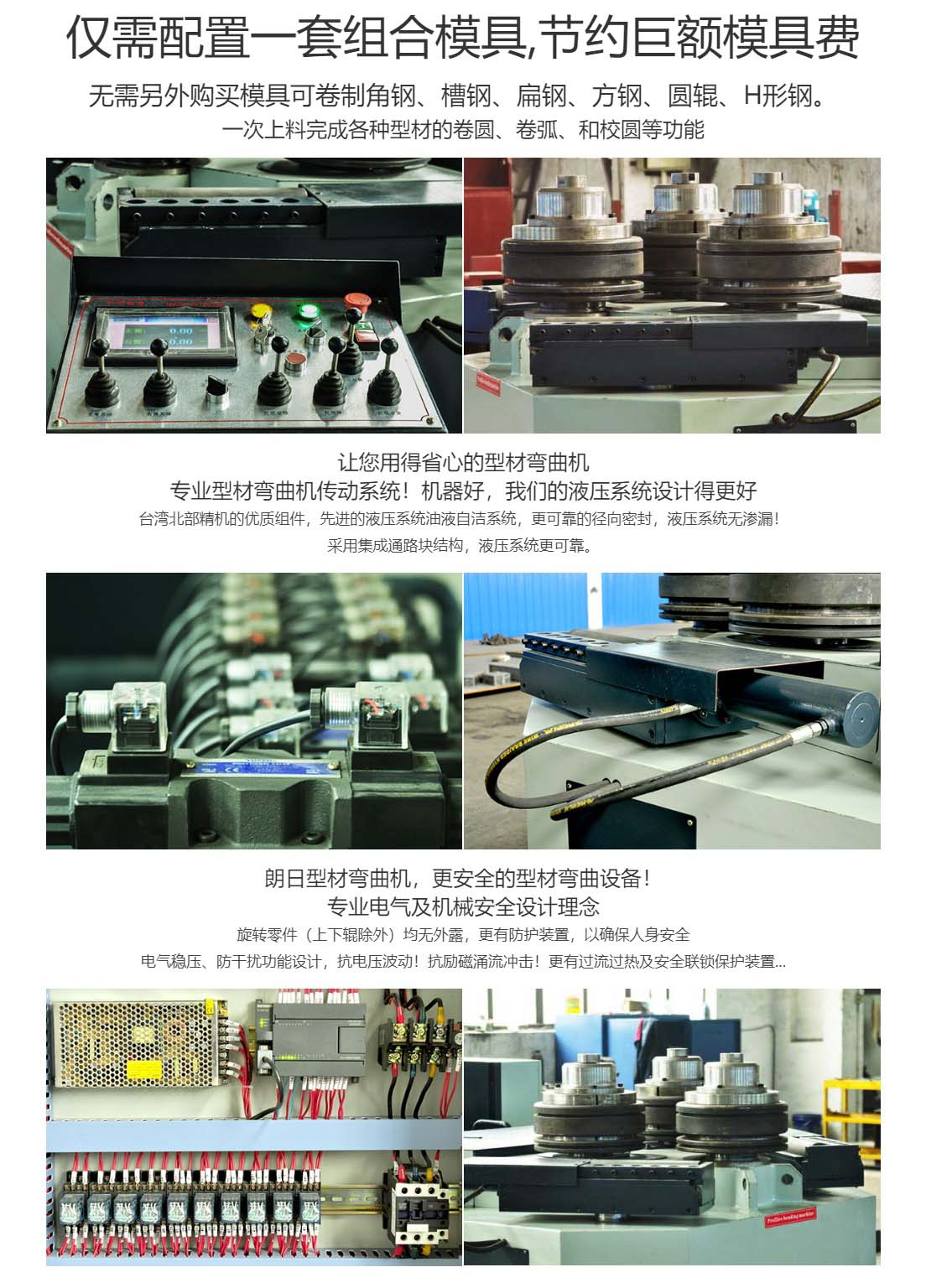 公司主要產品有:大、中、小型,型材彎曲機、 型材卷圓機、 法蘭成型機等型材彎曲設備。我們的優勢:僅需配置一套組合模具,節約巨額模具費無需另外購買模具可卷制角鋼、槽鋼、扁鋼、方鋼、圓輥、H形鋼。一次上料完成各種型材的卷圓、卷弧、和校圓等功能。支持非標定制。